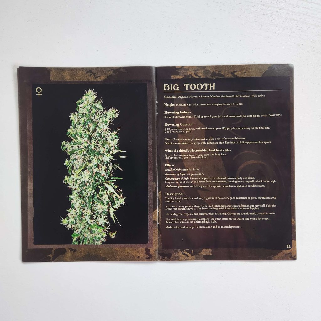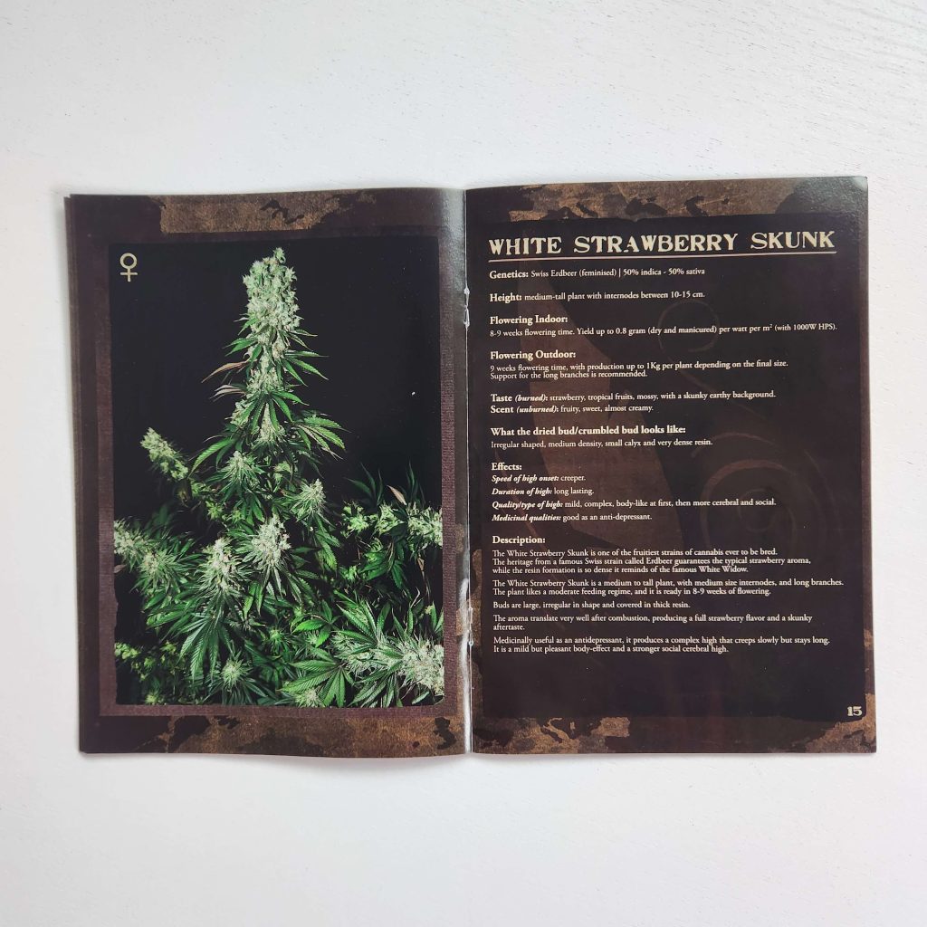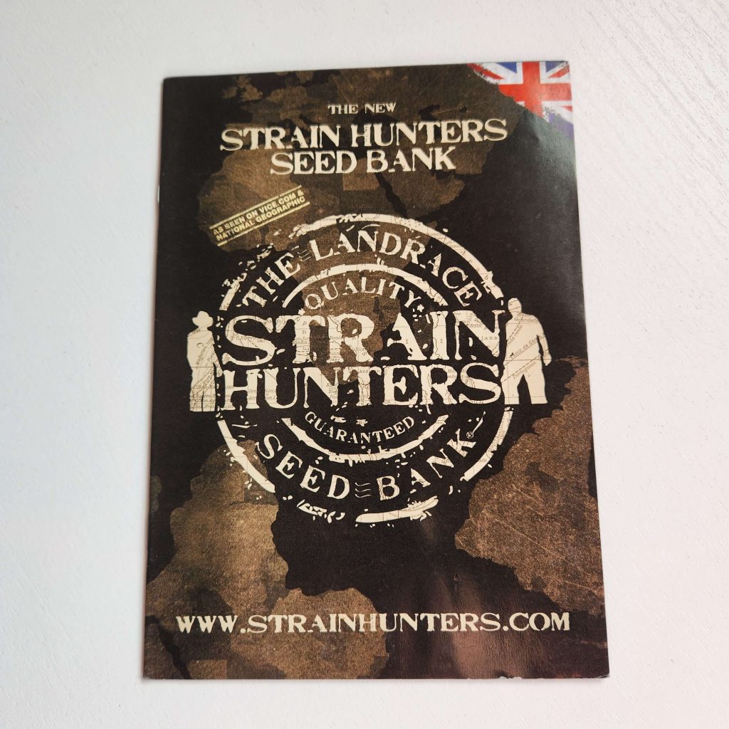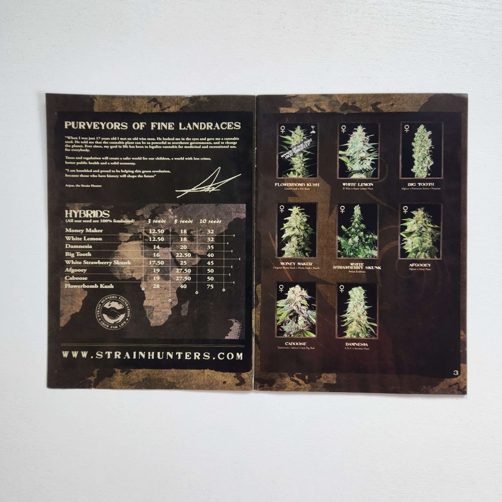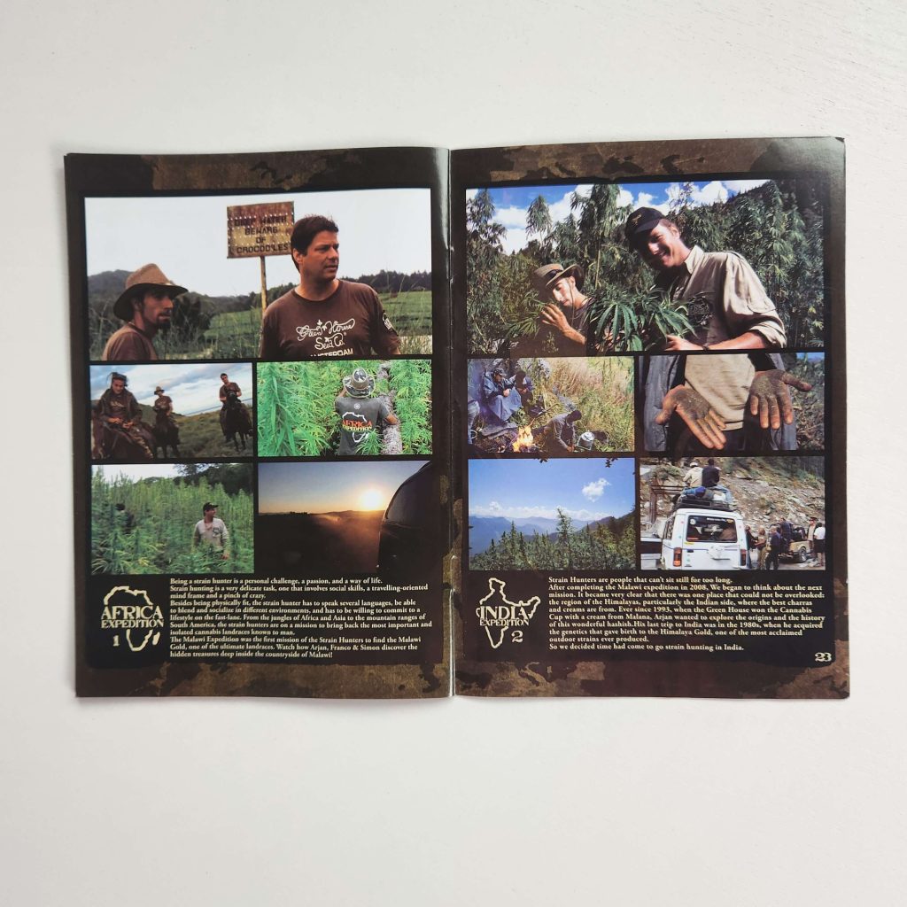 The Strain Hunters strain catalog has always been printed on glossy, magazine-like paper. It has high-resolution photos: buds and leaves under a microscope, harvest, all in an expensive black-and-gold style. Every page is shiny and wrinkle-free. Fans of the seed bank still keep the catalogs prominently displayed. Especially the early versions from the 2008 — 2009, with photos from expeditions, are popular.