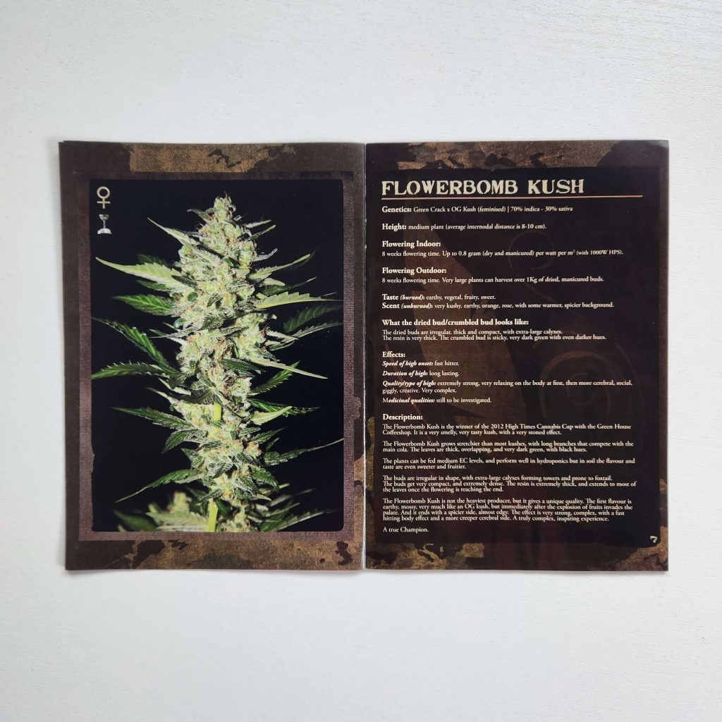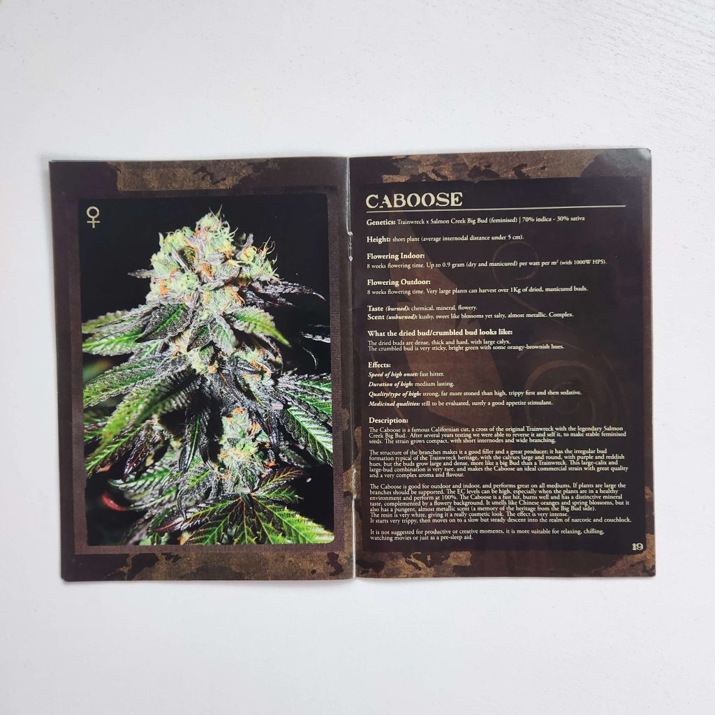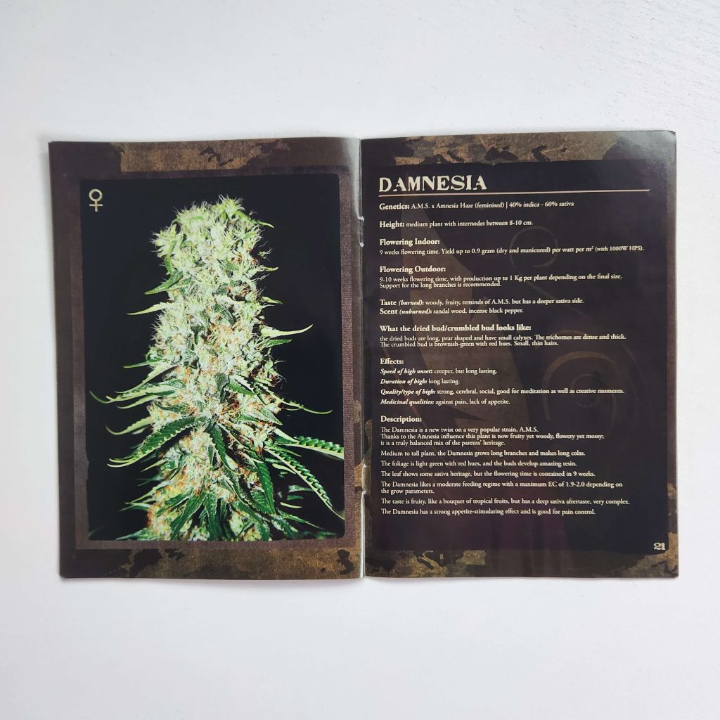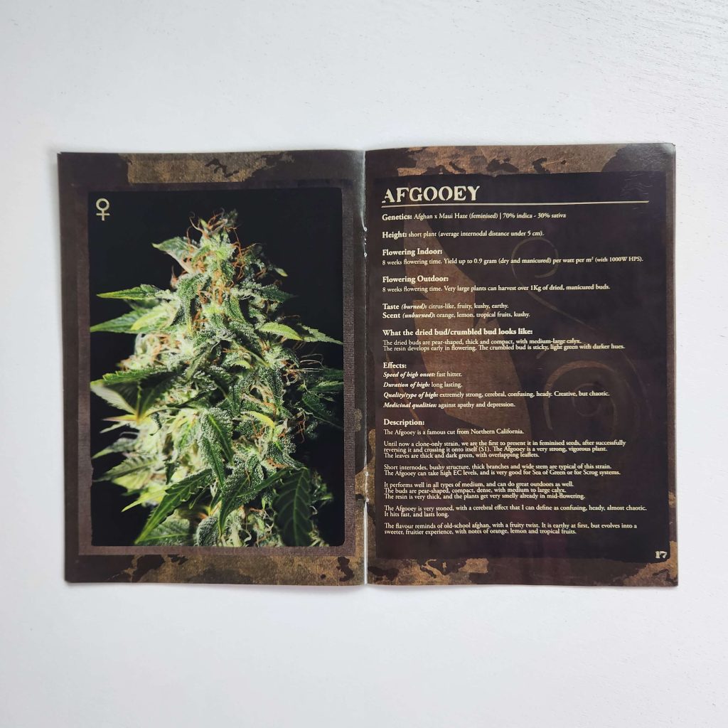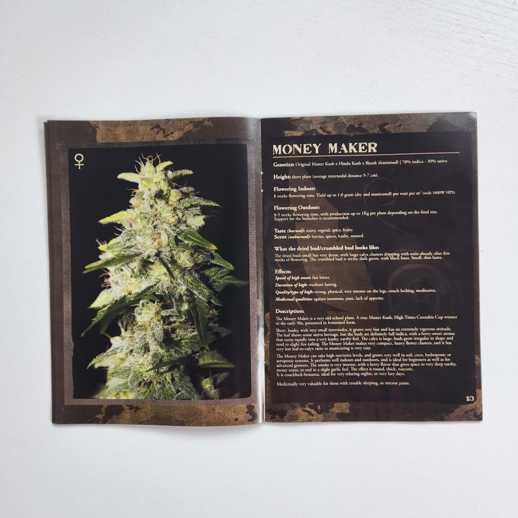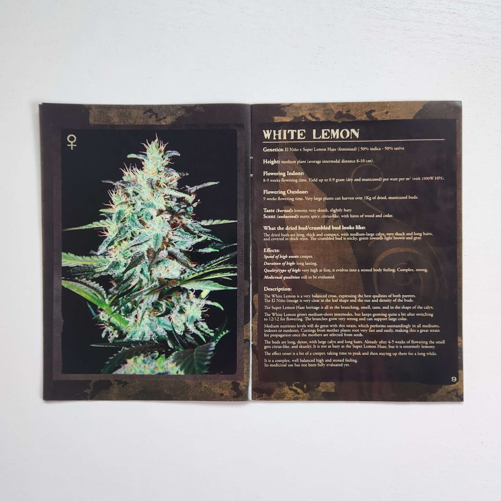 The Strain Hunters strain catalog has always been printed on glossy, magazine-like paper. It has high-resolution photos: buds and leaves under a microscope, harvest, all in an expensive black-and-gold style. Every page is shiny and wrinkle-free. Fans of the seed bank still keep the catalogs prominently displayed. Especially the early versions from the 2008 — 2009, with photos from expeditions, are popular.