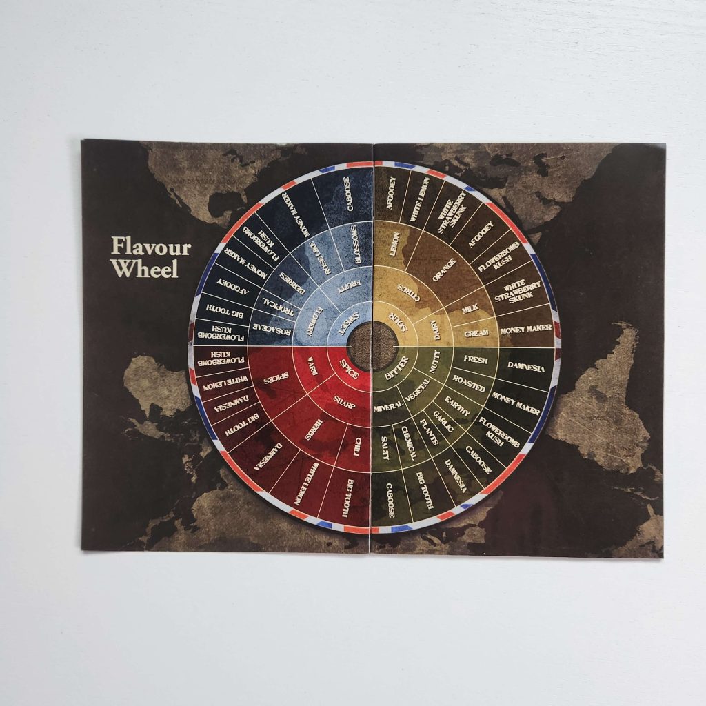 «Flavor Wheel» made by Strain Hunters, is a mini-encyclopedia of their strains’ flavors. Designed in the style of their signature cards. The wheel is divided into color-coded segments. Colours ranging from red (spicy) to green (earthy) and blue (citrus). Wheel feature strains like Money Maker, Flowerbomb Kush, and Damnesia. Each segment is associated with basic flavors. «Fresh,» «Roasted,» «Citrus,» «Spicy,» and even «Chemical,» reflecting their approach to preserving authentic profiles.