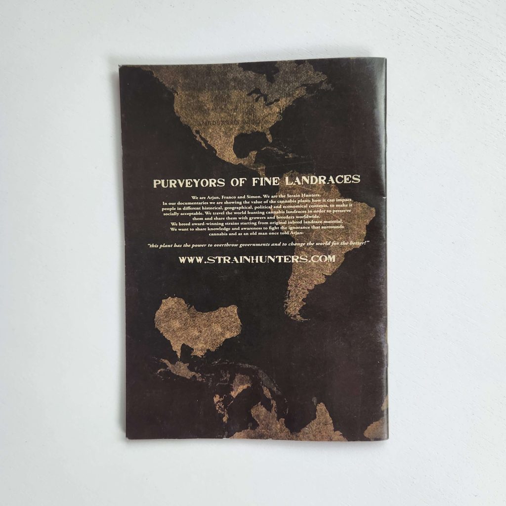 The back cover is like a mission statement for Strain Hunters! Against a dark background with a worn world map, in the style of their signature design, the inscription «Purveyors of Fine Landraces» stands out—their pride in preserving rare landraces. The text by Arjan and Franco explores how cannabis impacts people, culture, and even governments through documentaries. They emphasize their role: collecting seeds from around the world, working with locals, and sharing knowledge with breeders. The quote «This plant has the power to overthrow governments and change the world for the better» is their challenge to the system. The website www.strainhunters.com is listed as the center of their work. This is not just a cover, but a symbol of their fight for cannabis biodiversity.